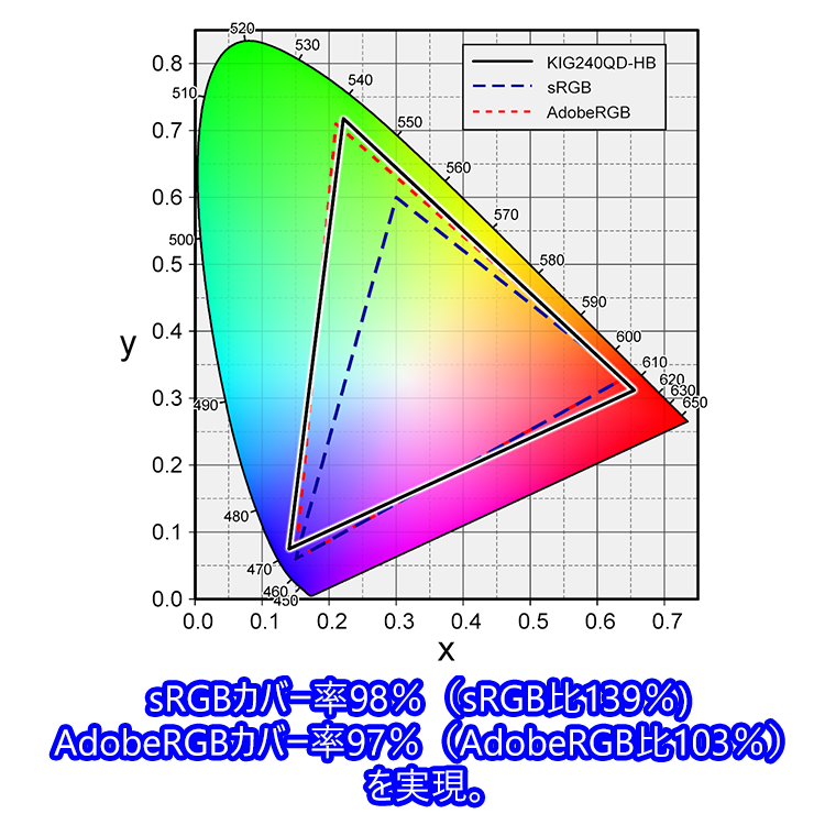 輝度を従来品「KIG240QD」の300cd/m2から400cd/m2にアップし、よりくっきり鮮やかな映像へパワーアップ。