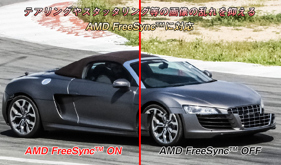 FreeSync機能に対応しており、対応GPUを使用することでテアリング(ちらつき)やスタッタリング(カクつき)を抑え、安定したなめらかな映像を表示できます。
